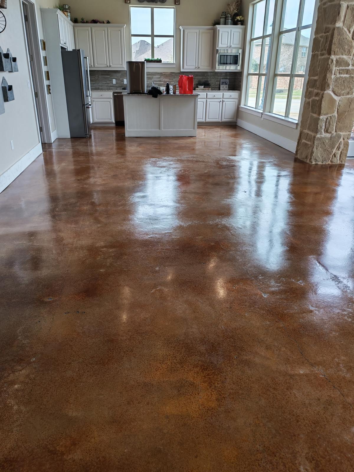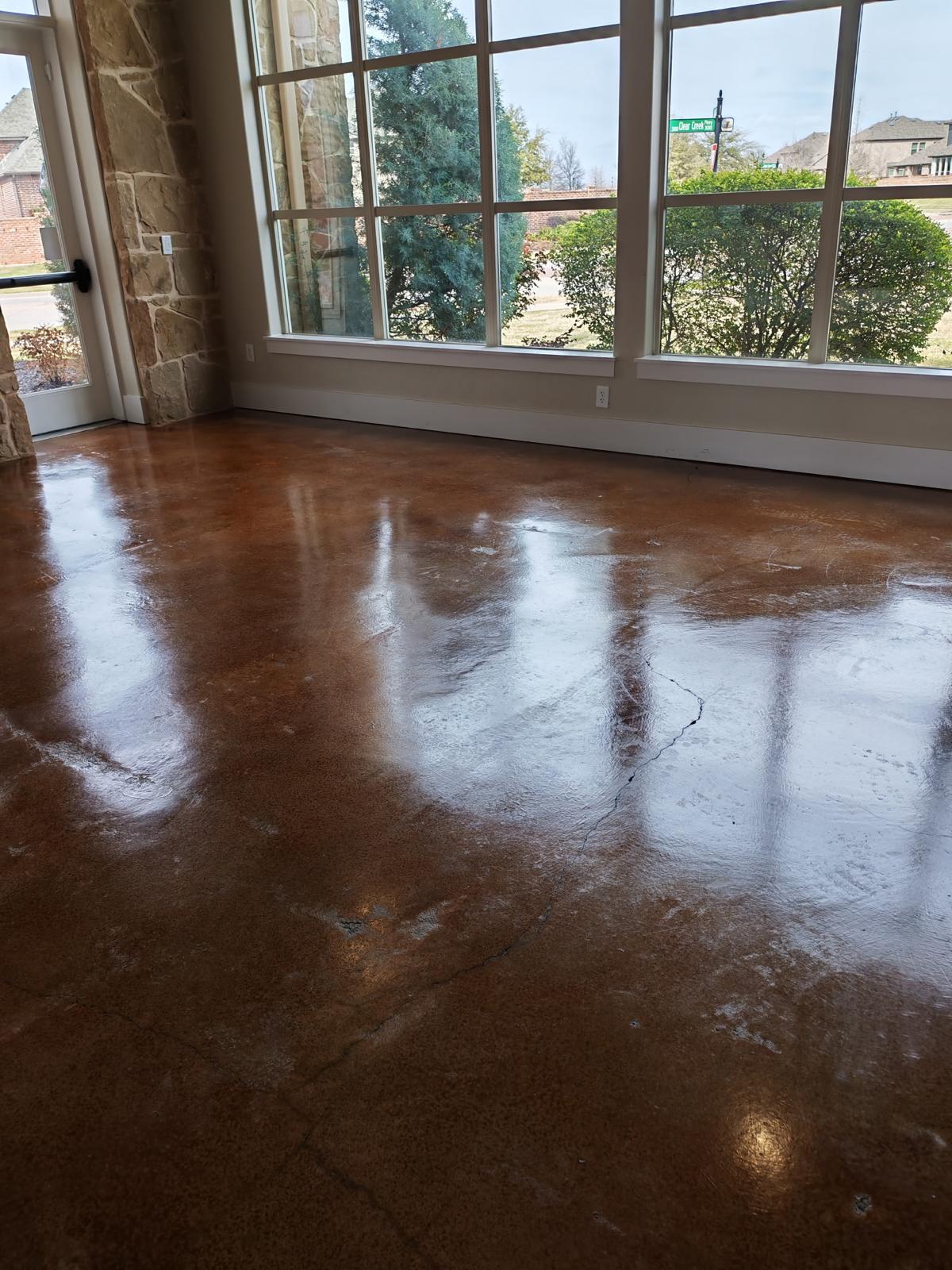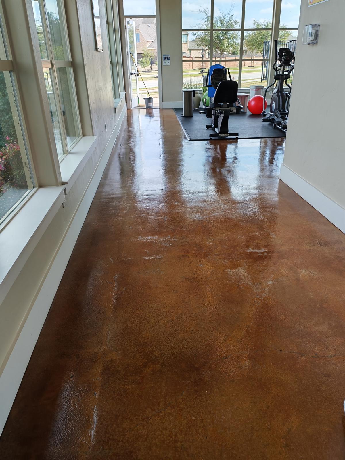 The interior spaces of the facility had stained concrete and it had developed dirt and debris that was causing the stained concrete area to look dingy. We scrubbed the floor and removed the scuff marks. Then we added wax to reseal the area. They were so grateful the area regained it's luster and shine.